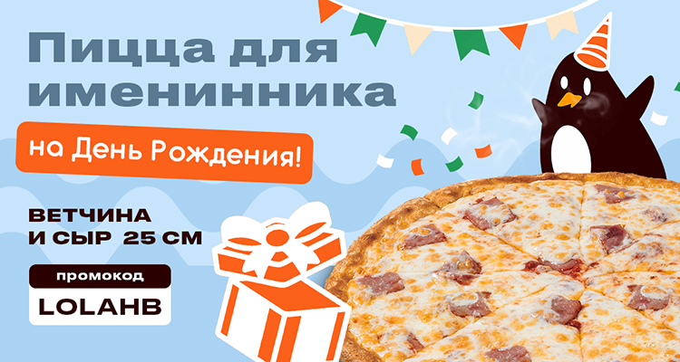 Лола Пицца дарит пиццу ветчина и сыр 25 см к заказу от 990₽ в день рождения!
